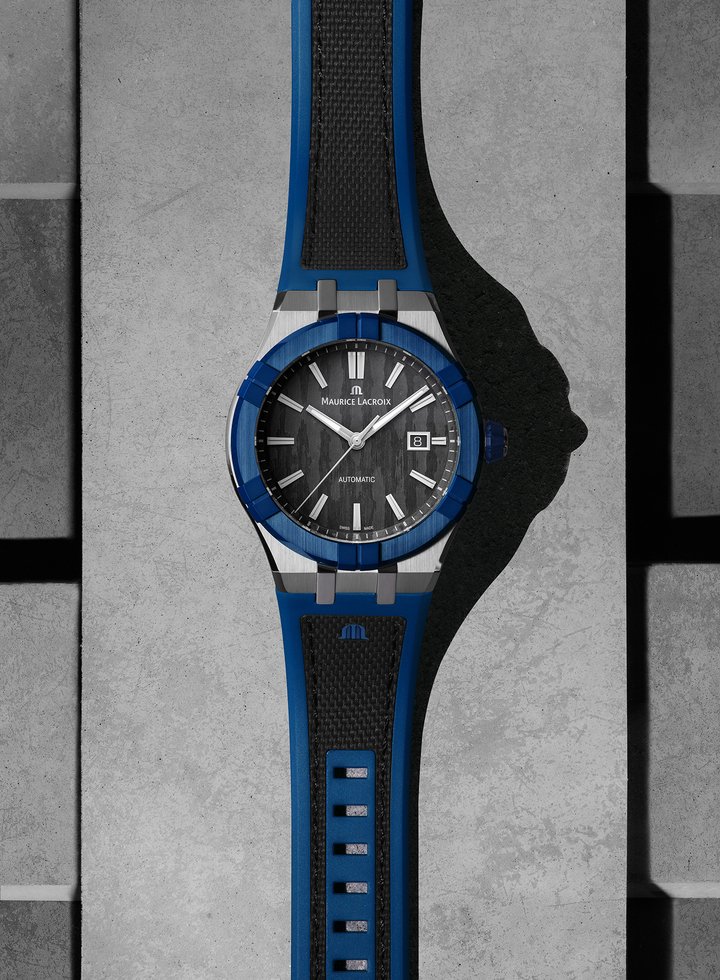 The Aikonic features a carbon dial with a difference. Most carbon structures are formed of interwoven carbon fibre strands, arranged at angles to create patterned weaves. However, the Aikonic’s carbon dial incorporates numerous fibres running north to south in one direction which appear as grey and black lines. As part of the dial-making process, the arrangement of carbon fibres will always be slightly different, resulting in each dial having its own unique appearance. Normally, carbon dials are the preserve of Haute Horlogerie; Maurice Lacroix has democratised this form of display.
