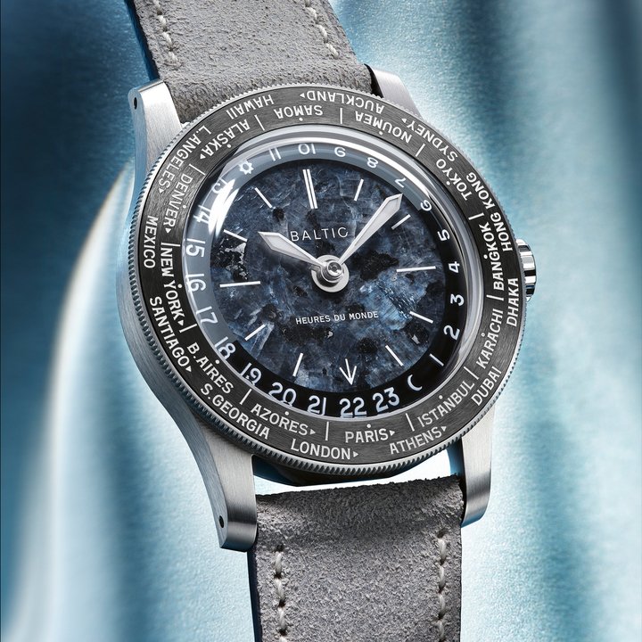 With the Heures du Monde, Baltic offers its contemporary take on the worldtimer inspired by Louis Cottier. Powered by a Soprod C125 movement, it displays time zones via a rotating 24-hour disc combined with a ceramic bezel. Housed in a compact 37mm case and water-resistant to 100 metres, it balances elegance and tool-watch spirit. Available with natural stone dials—labradorite, tiger’s eye or sodalite—each piece is unique.