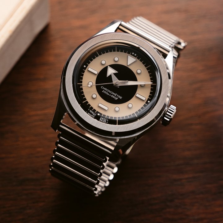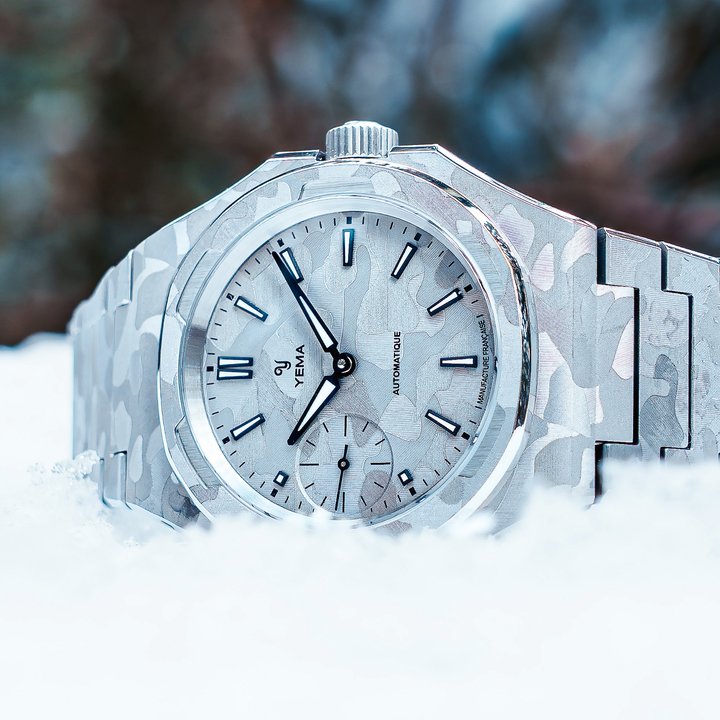 Founded in 1948, Yema is a historic independent French brand producing its own manufacture calibres. With the Wristmaster Camo CMM.29, it revisits its integrated bracelet icon in an artistic “Snow camo” version. Its ultra-thin case contains the in-house micro-rotor calibre, visible through a transparent caseback, combining technical expertise with bold design.