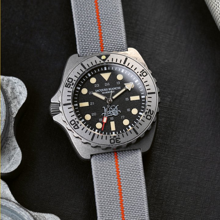 A leading name in French dive watches, Jacques Bianchi Marseille develops purpose-driven timepieces focused on readability and robustness. With the JB300 Poulpro, limited to 300 pieces, the brand extends the success of the JB200 with a grade 5 titanium case and low-reflectivity finish. A functional and expressive tool watch designed for real underwater use.