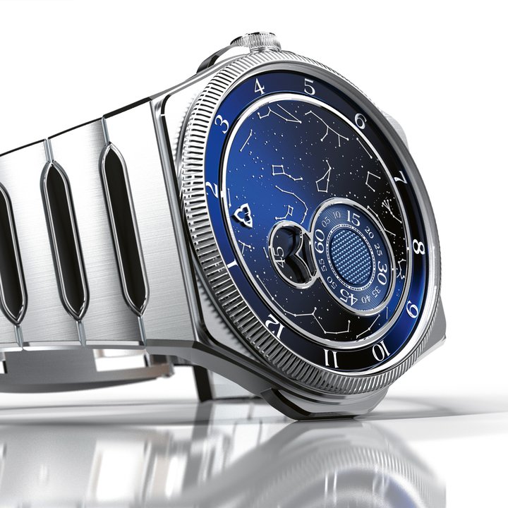 B.R.M Chronographes embodies independent French watchmaking inspired by motorsport, where each timepiece is fully machined and hand-decorated. This artisanal yet technological approach is reflected in innovative materials and bold constructions. In 2026, the brand highlights the V6-44-Midnight, a limited edition of 25 pieces. Featuring a blue PVD case and a hand-painted glitter dial, it captures the intensity of mechanical nights. With its dark and refined aesthetic, it perfectly translates B.R.M’s racing DNA into an elegant, immersive and contemporary interpretation.