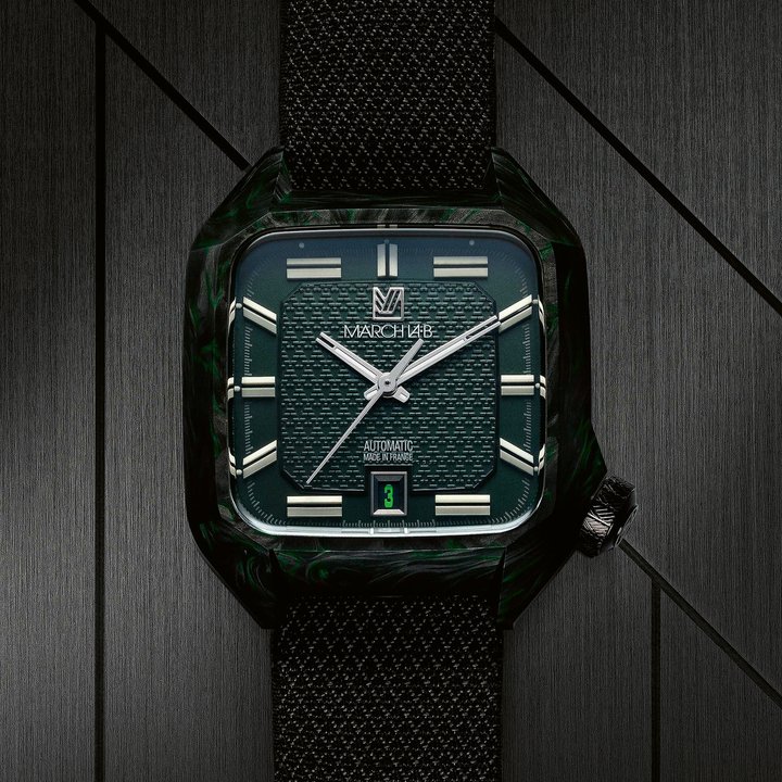 Founded between Biarritz and Los Angeles, March LA.B continues its “More with less” philosophy with the AM2 “Nyctalope” Carbon, a limited edition of 169 pieces. Its forged carbon case, blending deep green and black, interacts with light to reveal a unique luminescent depth. The green dial features a woven jacquard-inspired pattern, while Super-LumiNova blocks ensure striking nighttime legibility. Powered by the G100 automatic calibre with a 68-hour power reserve, it combines precision and endurance. Paired with interchangeable Julien Faure straps, this technical yet refined piece embodies a bold, contemporary vision of neo-vintage watchmaking.