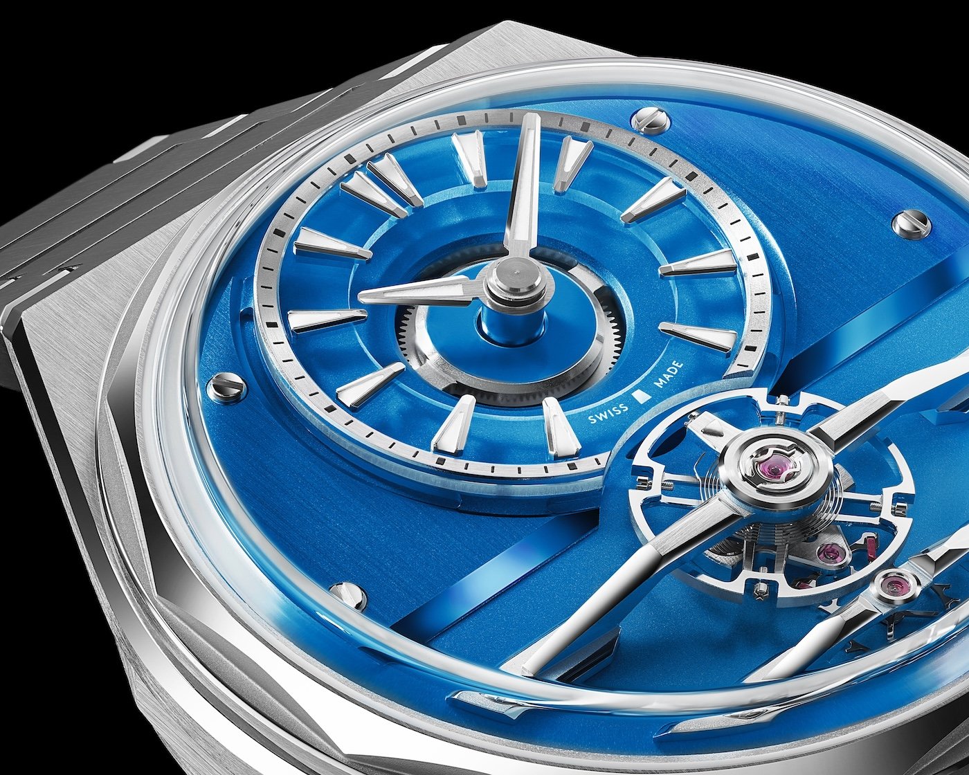 - The smoky fumé sapphire dial is topped with a blue Globolight® ring and linear-brushed hands, manually set with diamond-polished facets and blue Globolight® tips. The result is a striking visual display that transforms completely at nightfall, when the ring and the tips of the hands emit an intense green glow.
