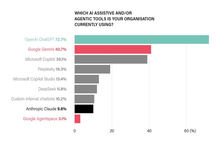 ChatGPT’s overwhelming dominance reflects its first-mover advantage and massive public popularity, making it the most accessible entry point for AI. However, it is difficult to say whether these are validated enterprise licenses, as over 35% of respondents claim that AI initiatives are funded through ad-hoc budgets. Many organisations may be relying on unvalidated individual subscriptions while enterprise AI strategies remain underfunded and undefined.