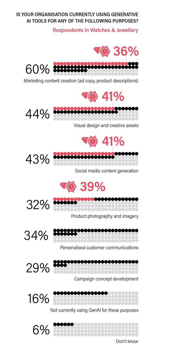 “AI still has a long way to go before it becomes reliable. We consider it’s only around 60% correct, hence we spend a lot of time doublechecking the information it provides. This minimises gains in efficiency from using AI. I wish it could be more trustworthy, so we could automate internal processes and even let it run part of our customer service on its own.” C-Suite Executive, Watches & Jewellery