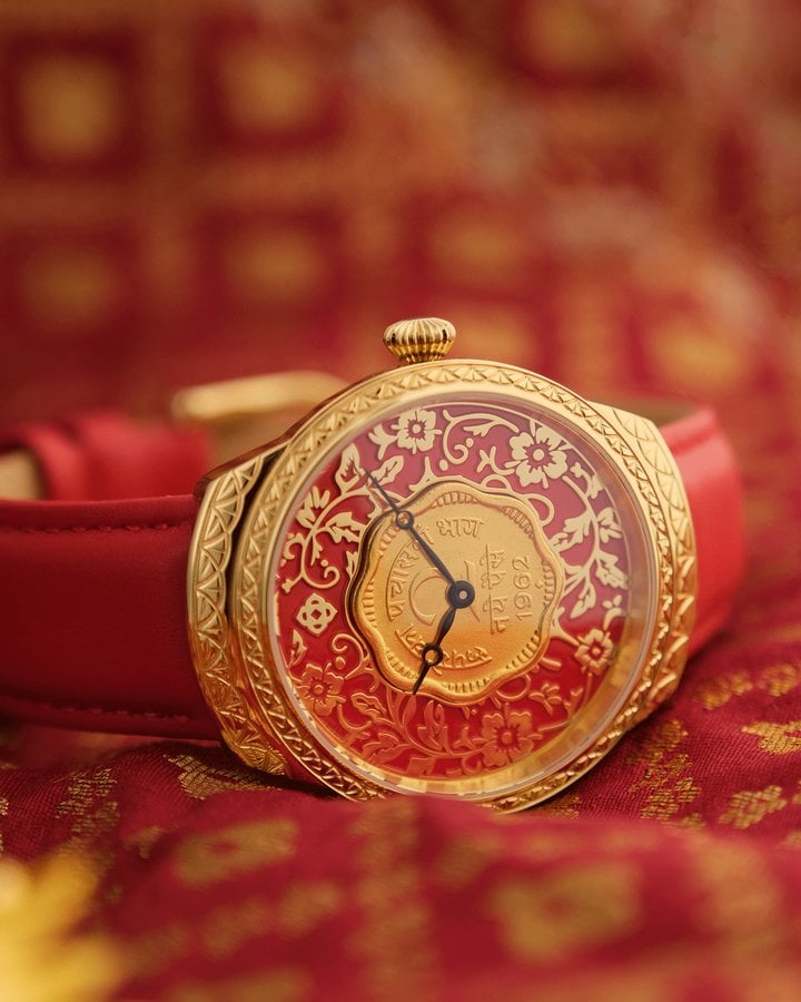The brand’s best-known models incorporate genuine antique coins, embedded in the dial like fragments of memory. Others pay tribute to the traditional arts of the subcontinent, from hand-painted Pichhwai to Jaipur miniatures, rare stamps (including the Penny Black, the world’s first adhesive postage stamp) and gold leaf motifs. One collection honours the legacy of the acclaimed Indian artist Raja Ravi Varma.