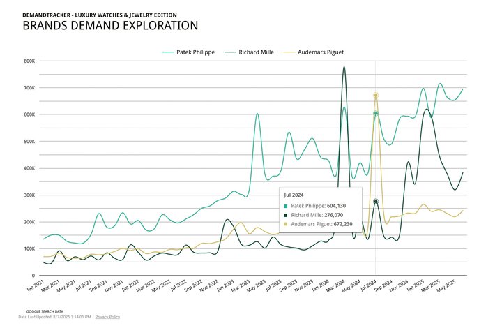 A Digital Luxury Group podcast analysed Google searches for watch brands around the time of the Ambani wedding in July 2024, which captured global media attention. According to its data, the event sparked search spikes for Audemars Piguet, Patek Philippe and Richard Mille. Proof, were it needed, that culturally significant events drive demand for watch brands.