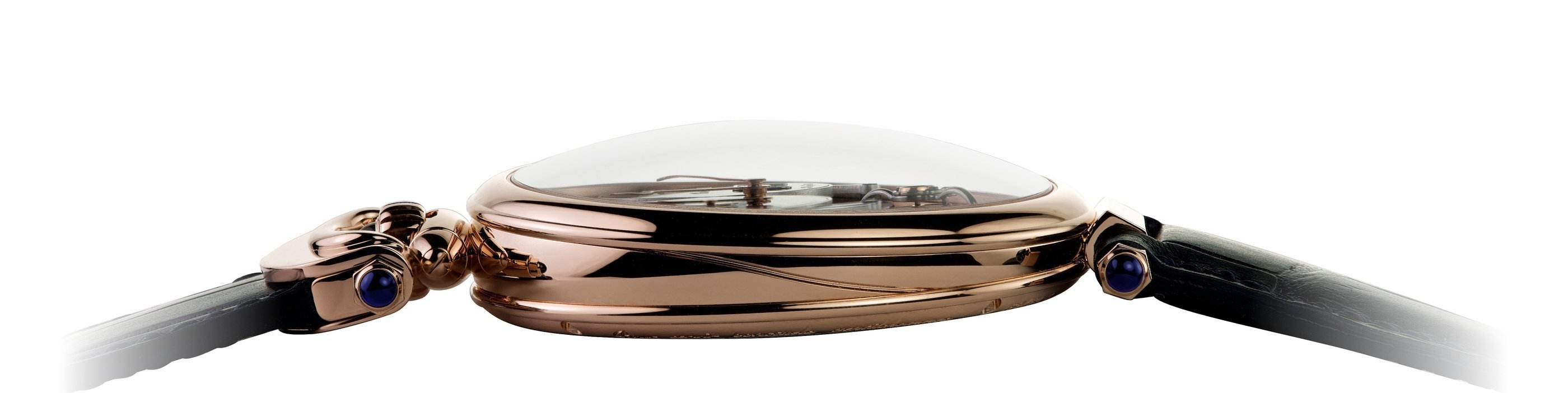 he Virtuoso VIII elegantly blends Bovet’s two iconic cases, the Fleurier and the Dimier since it is the first timepiece in the Fleurier collection to feature an inclined crystal aperture on the 12-6 o’clock axis. This innovative concept offers a new perspective on the caliber’s architecture, decoration, and function displays.