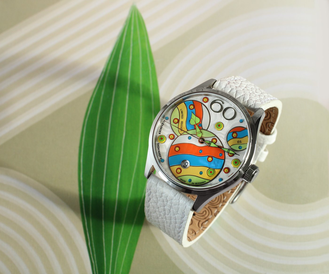 Staying true to the playful concept of colorful, round elements, it delivers a completely fresh interpretation. Like a creative ballet, vibrant spheres whirl across the dial. The larger orbs shimmer in striped, iridescent mother-of-pearl, while the smaller ones pop in vivid hues—perfectly coordinated. A softly wave-patterned white guilloché dial provides a calm yet captivating stage.