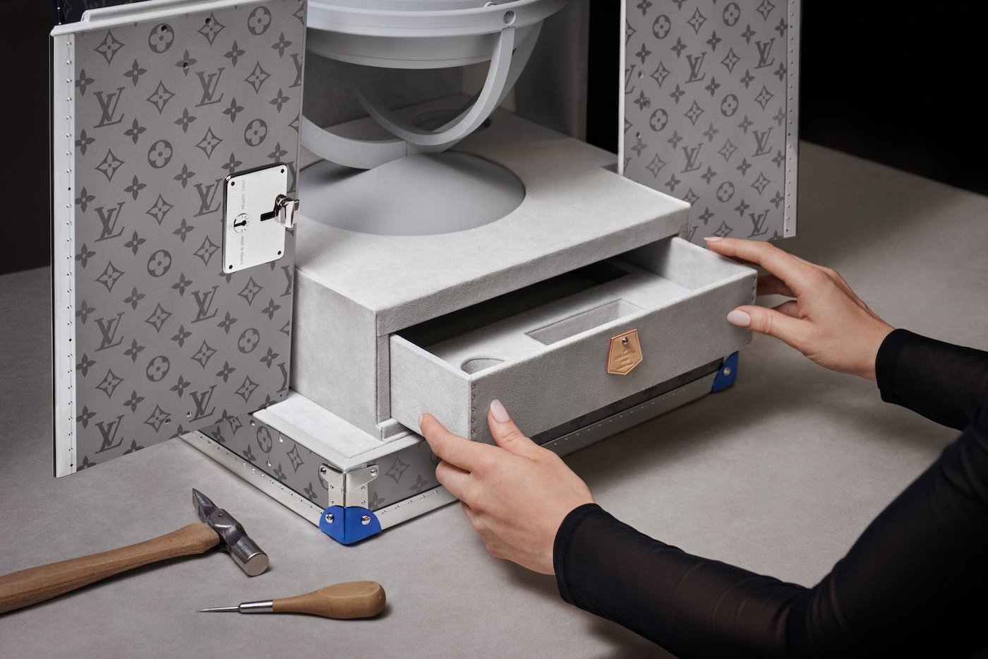 Conceived and crafted by the House’s master artisans in Asnières, the bespoke Louis Vuitton trunks are custom-built in polished titanium, a material chosen for both its rarity and the technical challenge it presents. Titanium corner protectors heat-blued by De Bethune and developed exclusively for this project, articulate their structures, while palladium lozines—echoed in the lock—punctuate the exteriors with measured restraint.